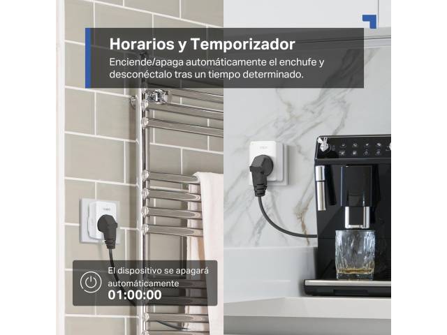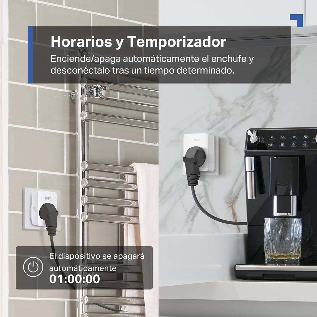 - Programación: Define horarios de encendido y apagado automático para cada enchufe inteligente Wi-Fi Tapo P110