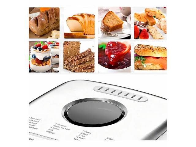 Panificadora eléctrica de 1 kg con múltiples funciones y pantalla digital, ideal para preparar panes caseros de distintos tamaños. Incluye temporizador programable de 15 horas, ventana superior de visualización, recipiente antiadherente extraíble y función de mantener caliente. Viene con taza y cuchara medidora para mayor comodidad.