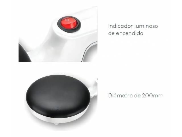 Panquequera eléctrica de 650 W con superficie antiadherente y diseño práctico para preparar panqueques de manera rápida y uniforme. Cuenta con asa para colgar, interruptor con luz indicadora y un diámetro de 200 mm. Incluye bowl o plato especial para sumergir la masa y facilitar el uso.