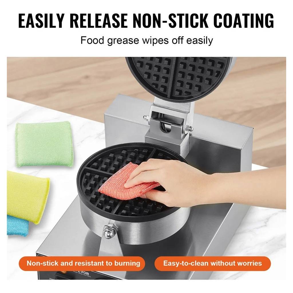 Posee placas de cocción con recubrimiento de teflón, resistentes a altas temperaturas y muy fáciles de limpiar. Gracias a su superficie antiadherente, los waffles no se pegan y se pueden preparar sin aceite ni manteca.