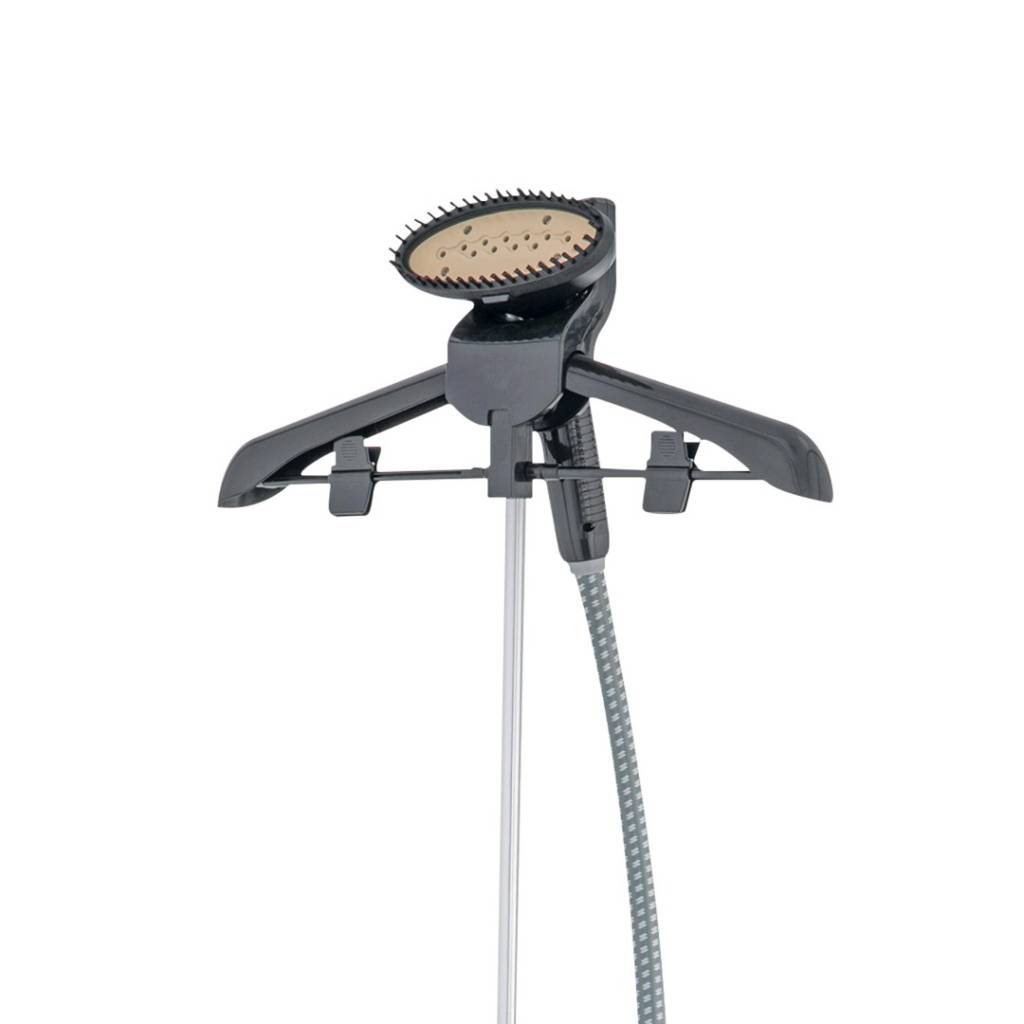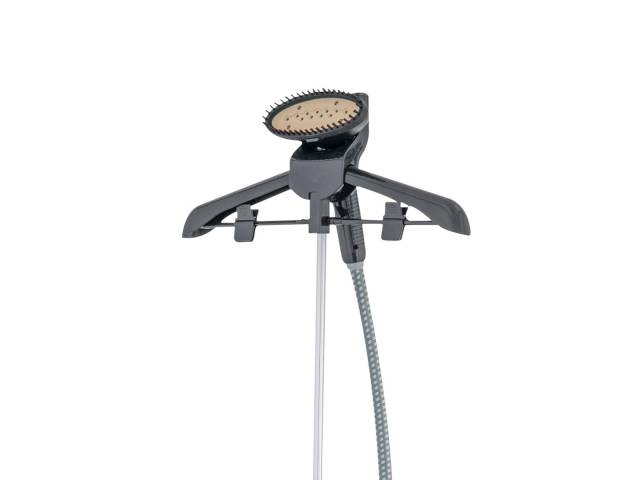 Plancha a vapor vertical de 1800 W con tanque de gran capacidad, ideal para desarrugar prendas rápidamente sin usar tabla de planchar. Incluye percha desmontable, temperatura regulable, puntero con cerdas y accesorio especial para cuellos, ofreciendo comodidad y eficiencia en el uso diario.