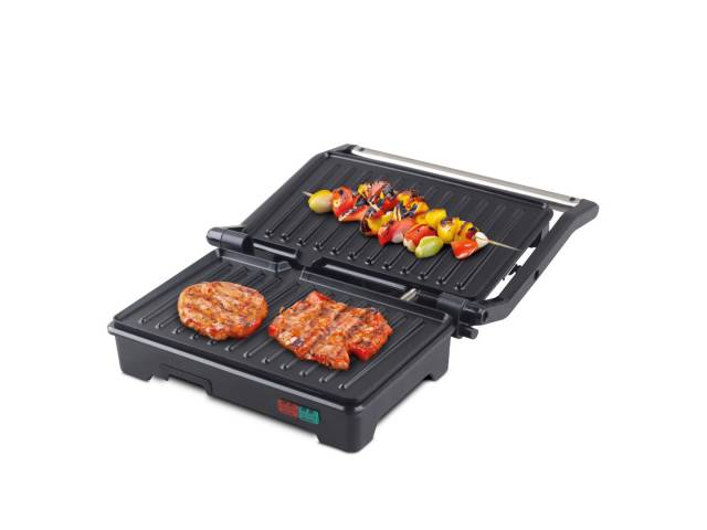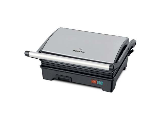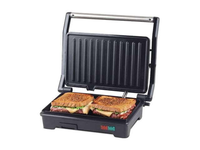 Sandwichera grill de 750 W con apertura de 90° o 180°, ideal para tostar, grillar y calentar alimentos con practicidad. Cuenta con placas antiadherentes, asa fría al tacto, luces indicadoras, bandeja recoge aceite y accesorio calienta panes para mayor versatilidad en la cocina.