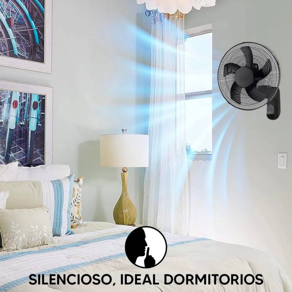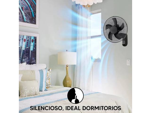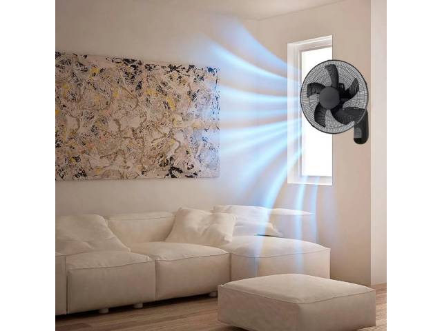 Ventilador de pared con control remoto y diámetro de 40 cm, ideal para ventilar espacios sin ocupar superficie. Ofrece 3 velocidades, función oscilante, 5 aspas, inclinación ajustable y rejilla metálica de protección.