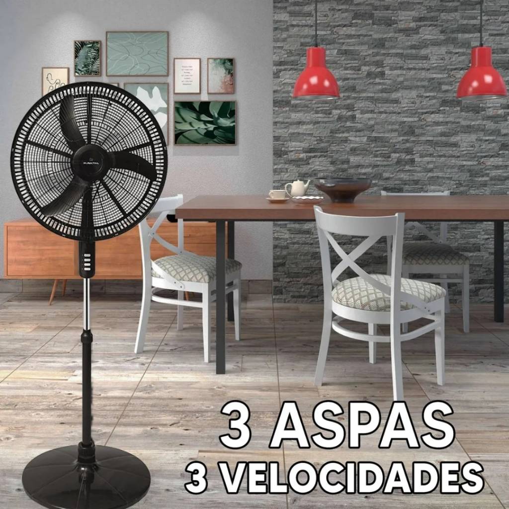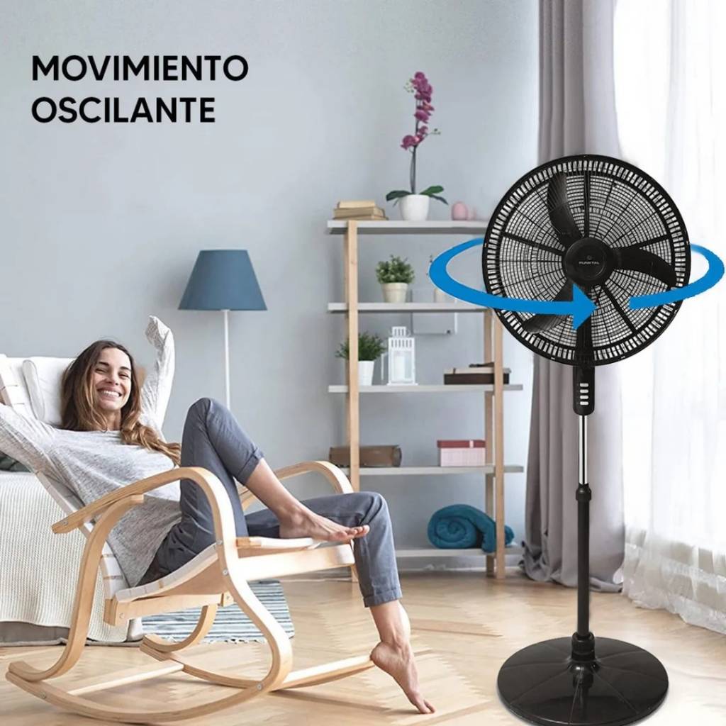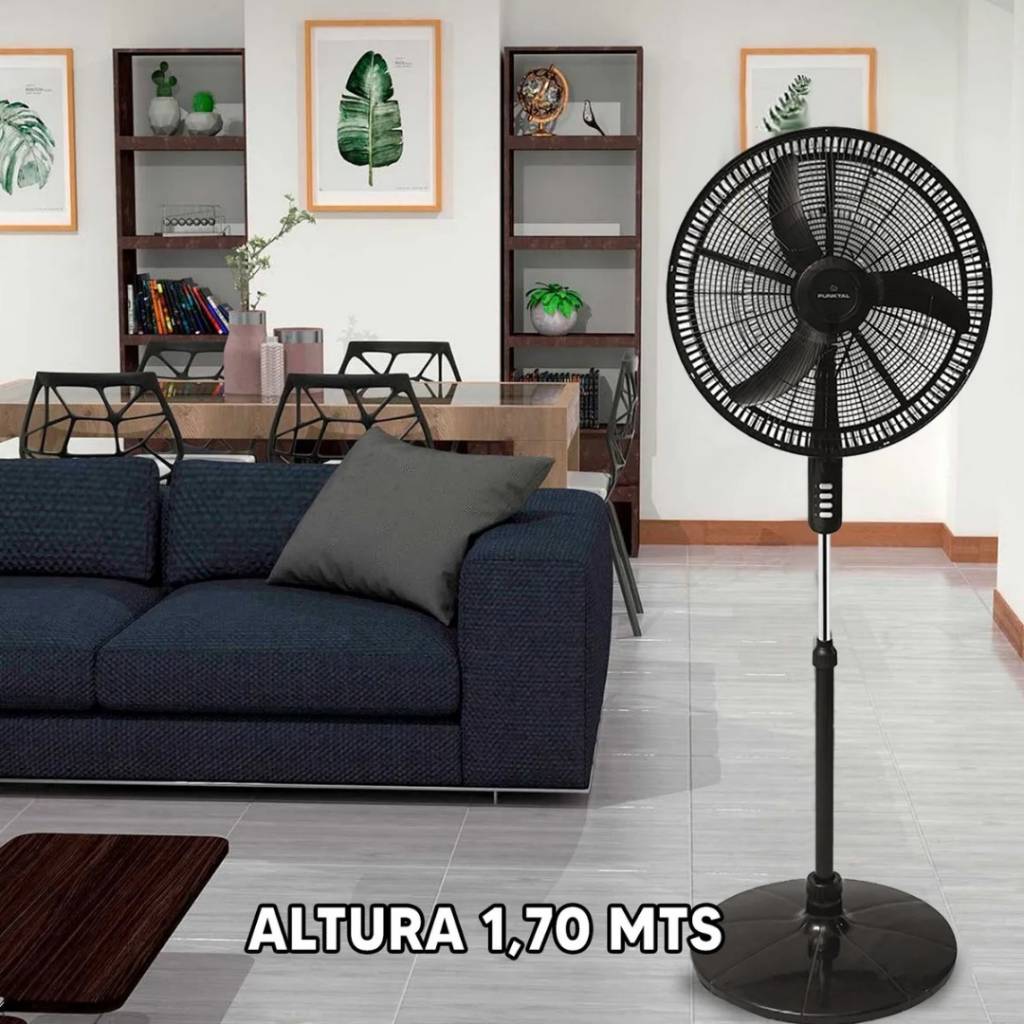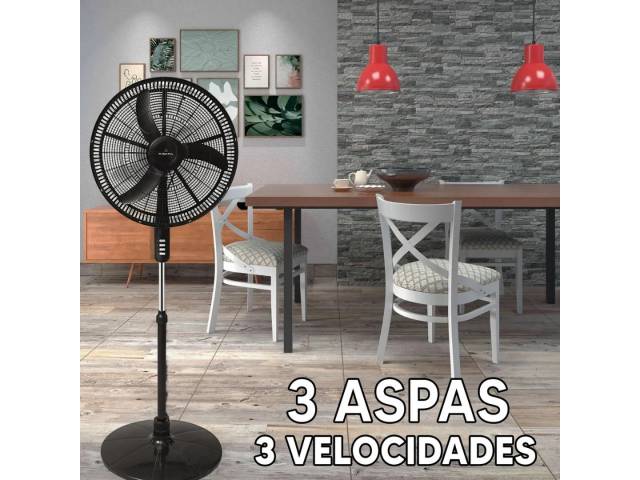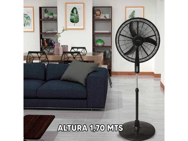 Ventilador de pie con diámetro de 50 cm y altura regulable hasta 1,70 m. Cuenta con 3 velocidades, 3 aspas, inclinación ajustable y función oscilante. Ideal para ventilar ambientes amplios con un caudal de aire potente.