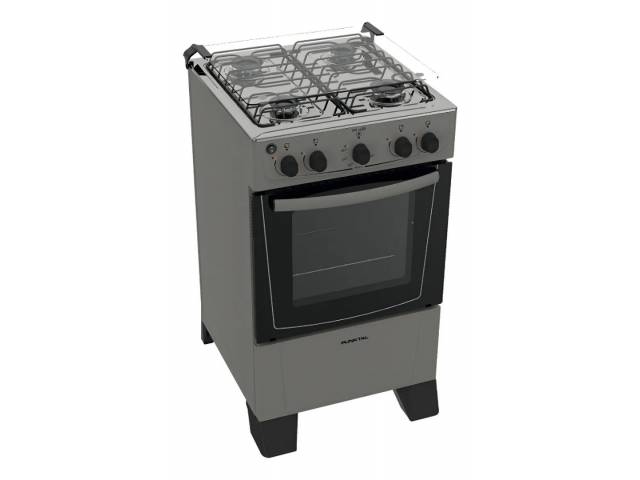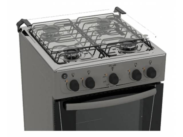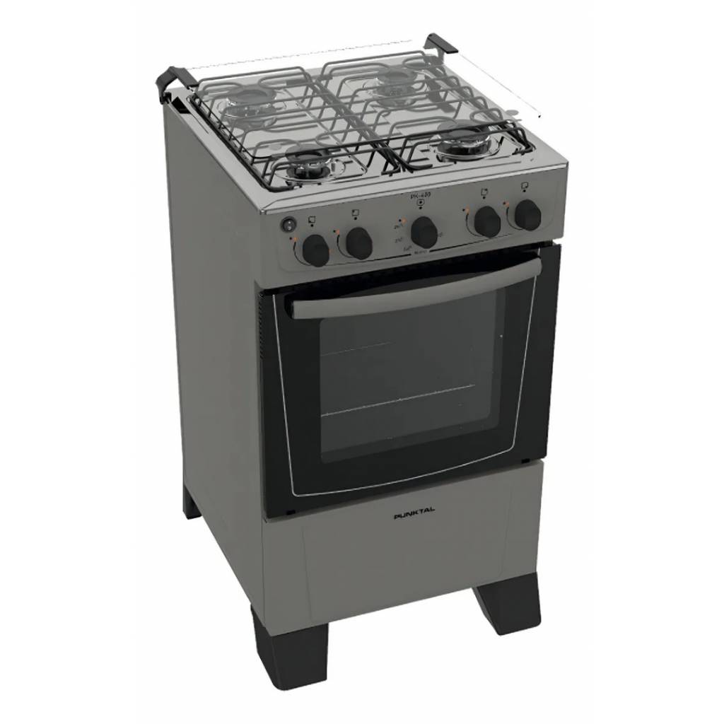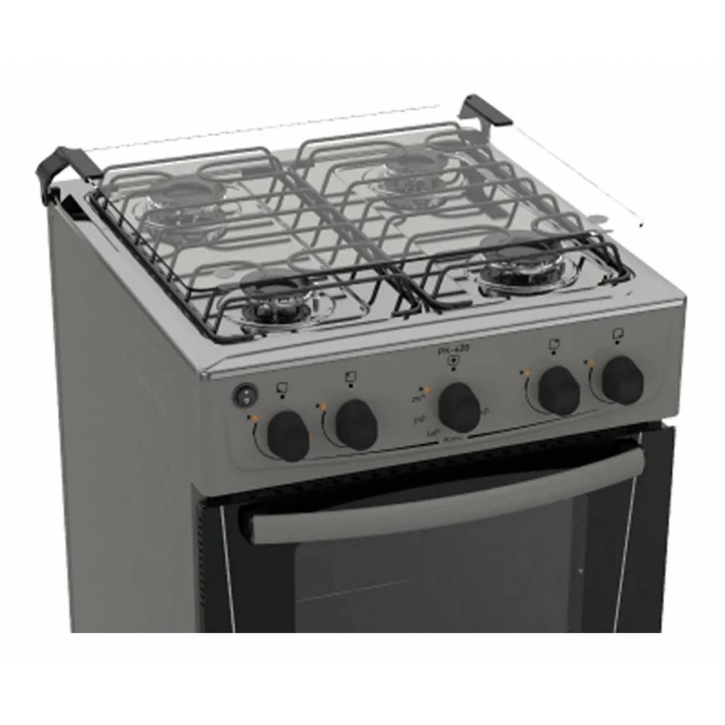 Cocina a supergas de 4 hornallas con mesada de acero inoxidable y terminación Titanium. Incluye kit para gas natural, quemadores forjados, horno a gas con termocupla de seguridad, encendido electrónico, luz interna y tapa de vidrio. Ideal para un uso diario seguro y eficiente.