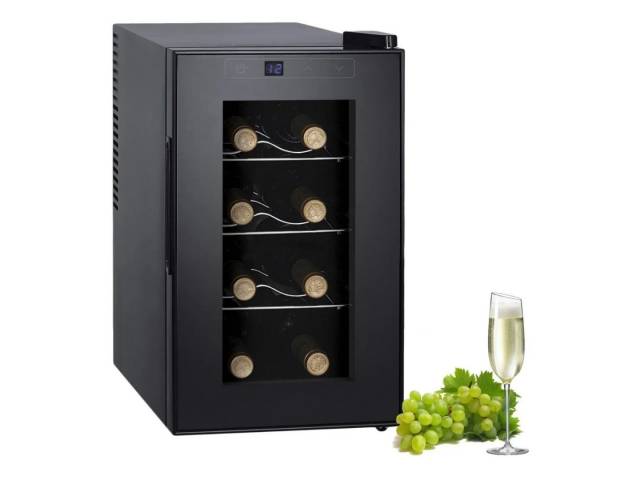 Enfriadora de vinos con capacidad para 8 botellas y 23 litros totales, ideal para mantener tus vinos a la temperatura adecuada. Cuenta con display digital, panel touch, luz interior y rango de temperatura regulable entre 8 y 18 °C.