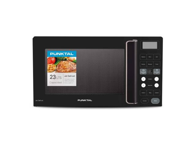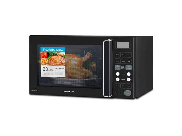 Microondas digital de 23 litros con grill y 900 W de potencia, ideal para calentar, dorar y cocinar de forma rápida. Incluye cocción combinada, funciones de descongelado por peso y JET, panel digital, luz interna y soporte para grill. Diseño en color negro.