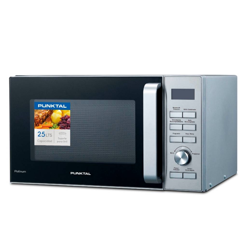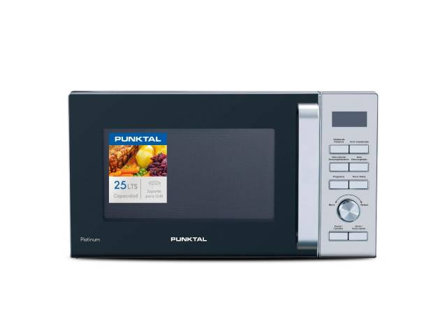 Microondas digital de 25 litros con grill y 900 W de potencia, ideal para cocinar, dorar y recalentar con rapidez. Cuenta con 6 niveles de potencia, luz interna, auto menú, auto defrost y panel con terminación inox. Incluye soporte para grill.
