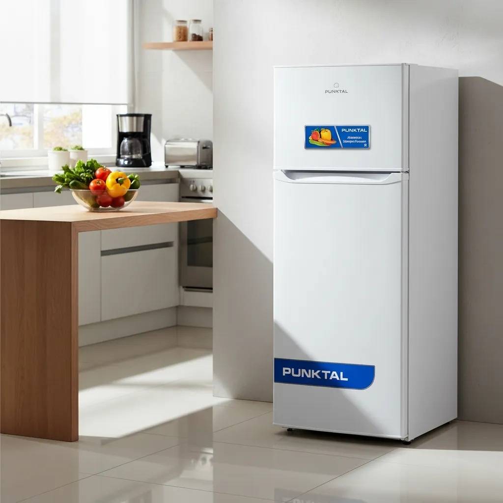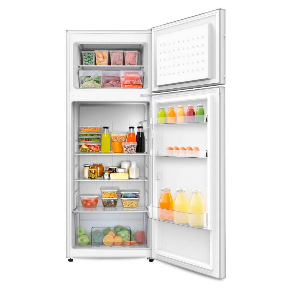 Refrigerador de frío natural con capacidad total de 215 litros, ideal para el hogar. Cuenta con freezer superior de 45 litros, refrigerador de 168 litros, puertas reversibles, control de temperatura y gas refrigerante R600a para un funcionamiento eficiente.