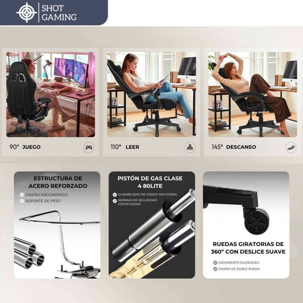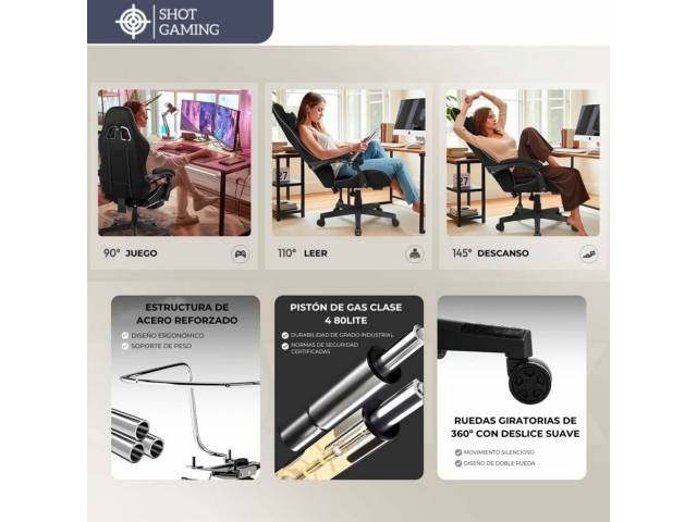 La Shot Gaming SHOT-NOVA es una silla gamer pensada para quienes buscan comodidad, resistencia y ergonomía en largas sesiones de uso. Su tapizado en felpa combinada con cuero ventilado ofrece una sensación más fresca y confortable, mientras que su estructura robusta con pistón clase 4 garantiza estabilidad y durabilidad. Incluye respaldo reclinable con bloqueo, apoyapiés retráctil y almohadas desmontables para cuello y zona lumbar, brindando una experiencia completa tanto para gaming como para trabajo.