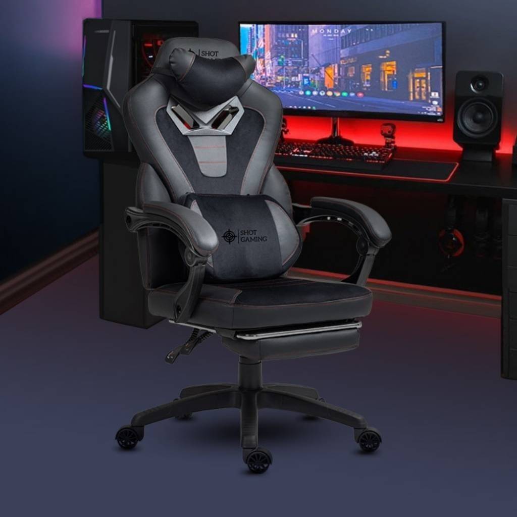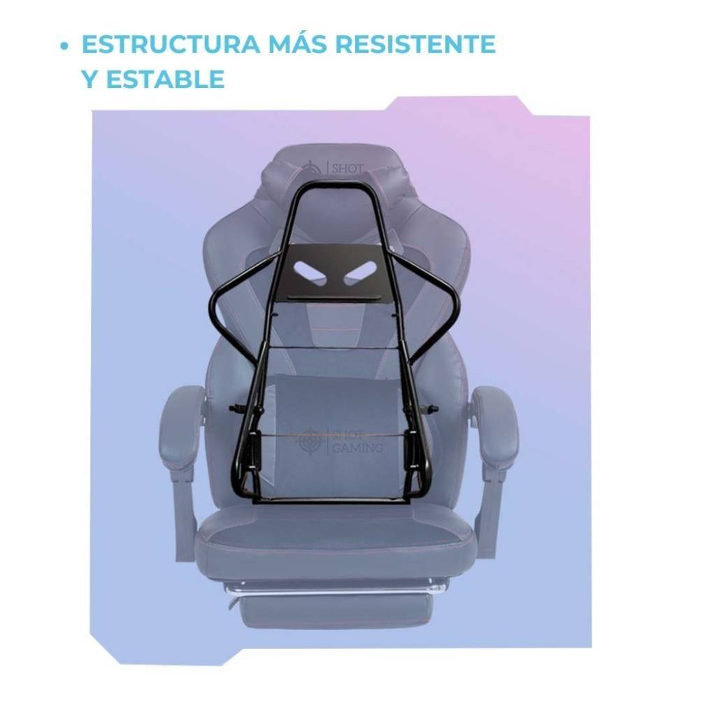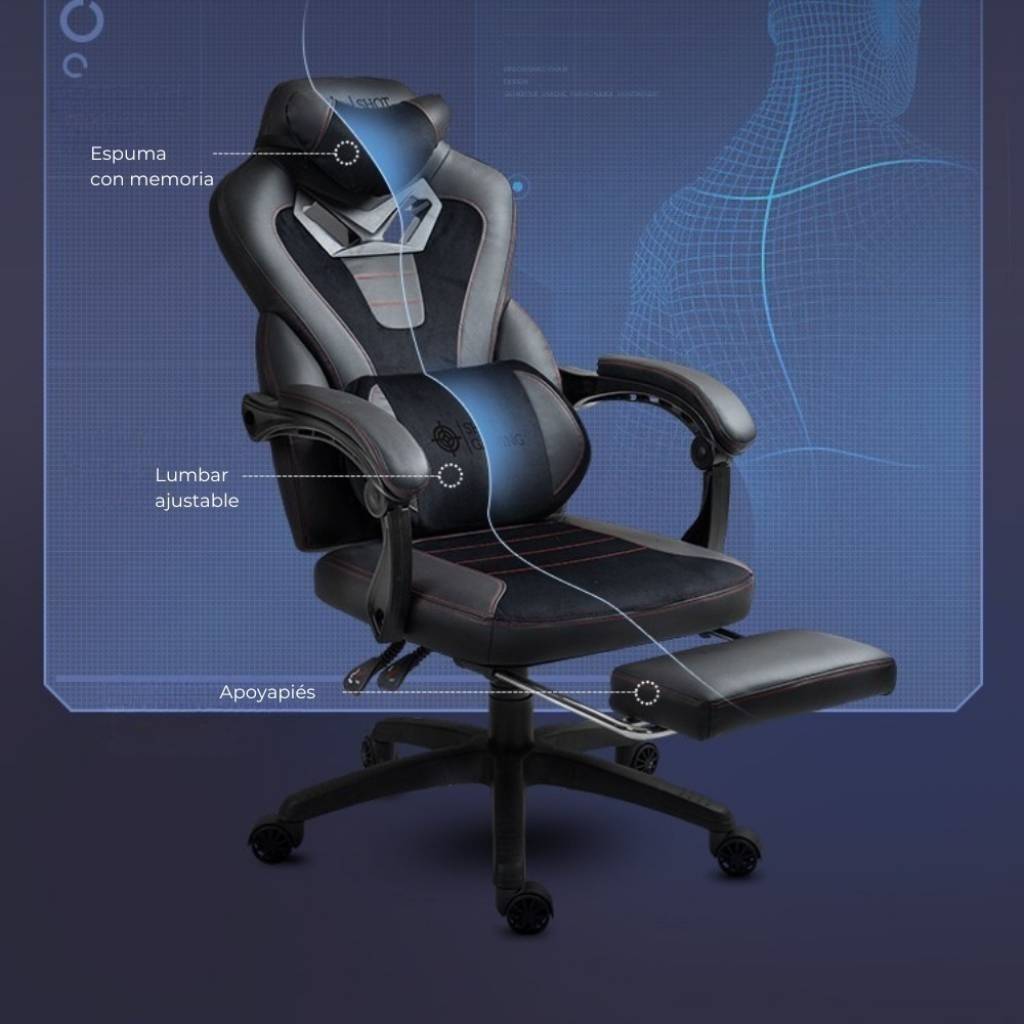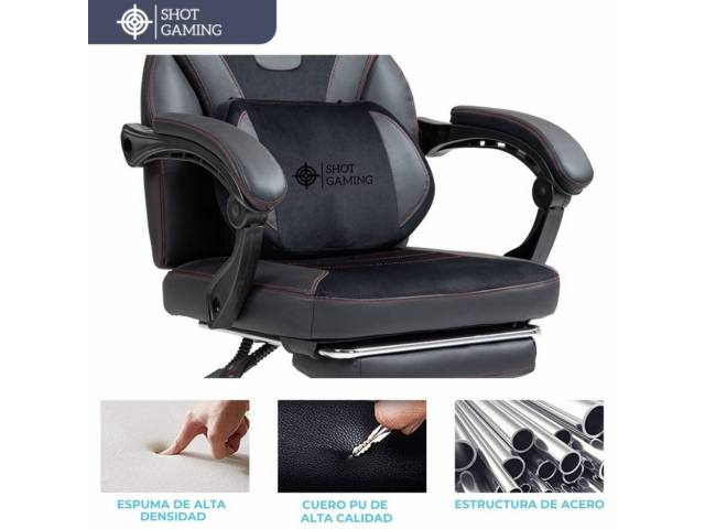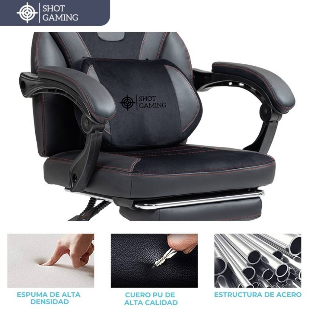 La Shot Gaming SHOT-TITAN es una silla gamer de alto rendimiento diseñada para ofrecer máxima resistencia, confort y ergonomía. Fabricada con cuero PU ventilado, espuma de alta densidad y estructura de acero, brinda una experiencia premium ideal para largas jornadas de gaming o trabajo. Incorpora respaldo reclinable, apoyapiés retráctil y masajeador lumbar, destacándose además por su mayor capacidad de carga y su pistón de gas clase 4, lo que la convierte en una opción robusta y duradera.