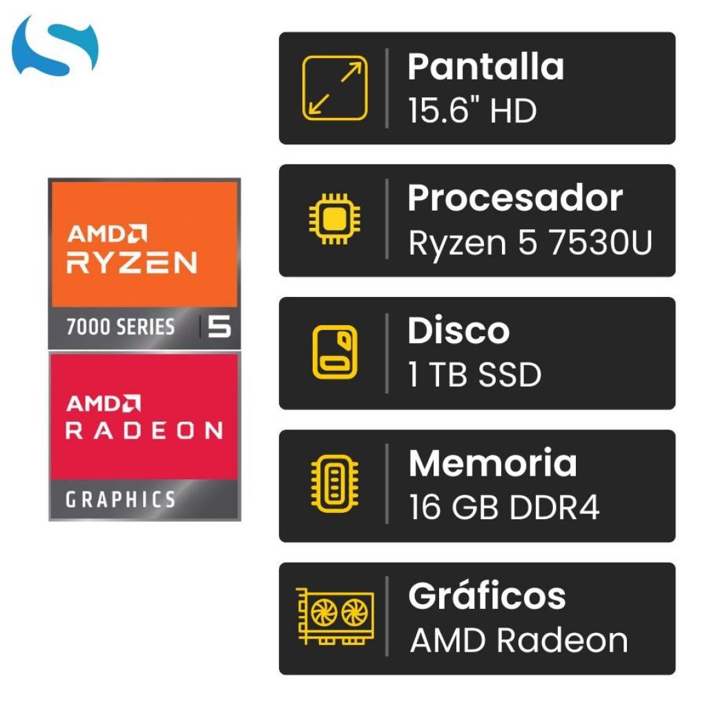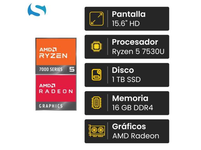 Procesador AMD Ryzen 5 7530U 2.0 GHz (hasta 4.5 GHz, 16 MB de caché, 6 núcleos y 12 hilos).