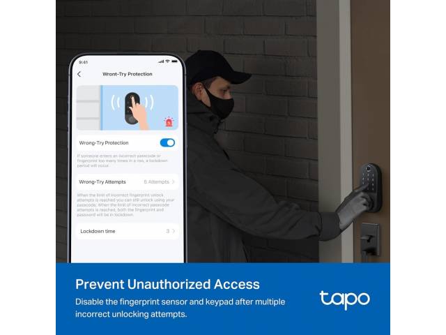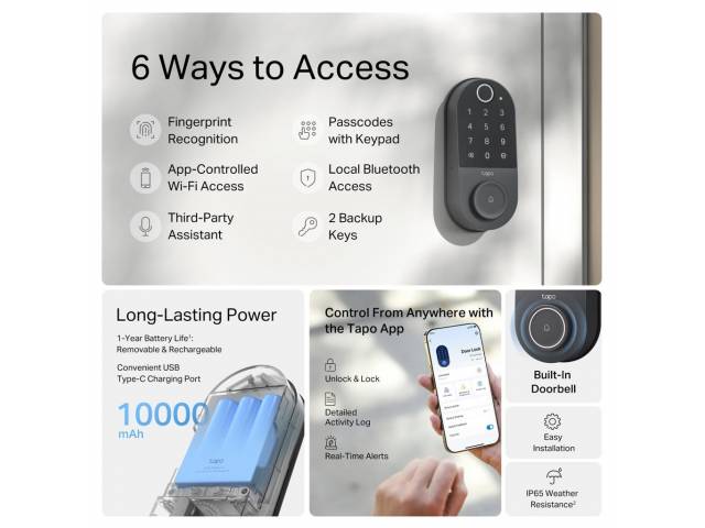 - 6 formas de acceder de forma segura: Desbloquee con la aplicación Tapo, mediante huella digital, Bluetooth, teclado, Asistente inteligente o con llaves de respaldo incluidas.