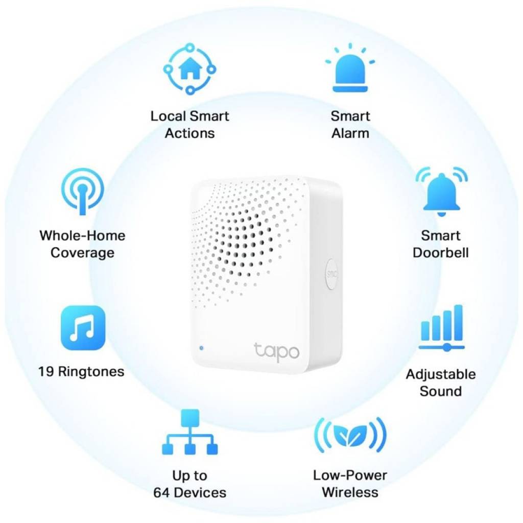 1 Tapo H100 de TP-Link Smart Hub con timbre incorporado, requiere Wi-Fi de 2.4 GHz, conexiones fiables de largo alcance con sensores Tapo, protocolo inalámbrico de baja potencia Sub-1G, conecta con hasta 64 dispositivos inteligentes.