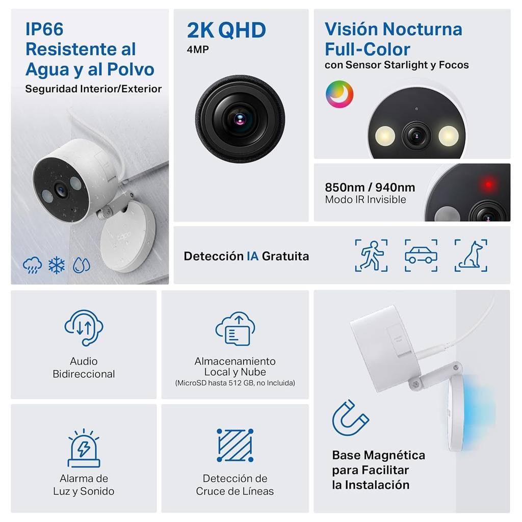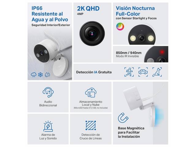 - Cámara de seguridad Wi-Fi para interior y exterior con resolución 2K QHD 4 MP para imágenes nítidas y detalladas.