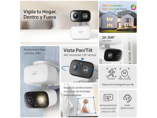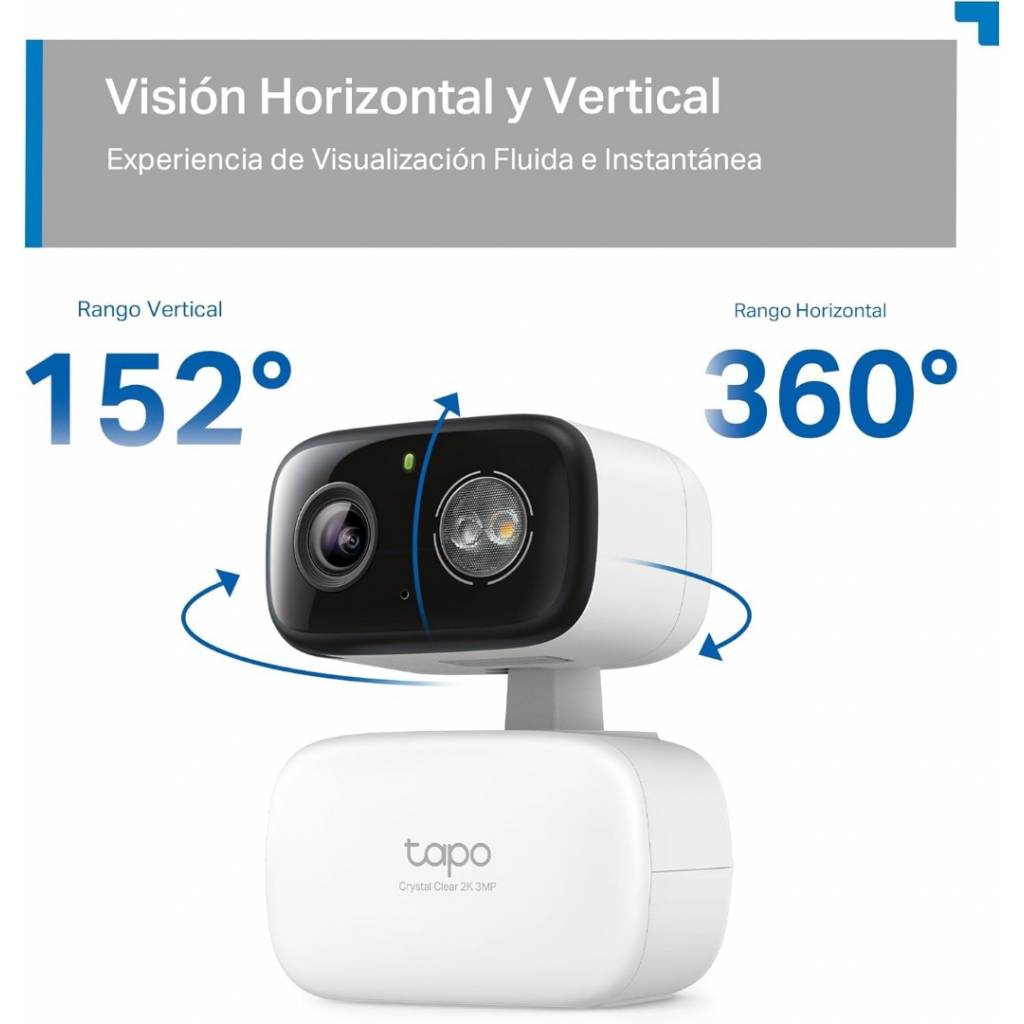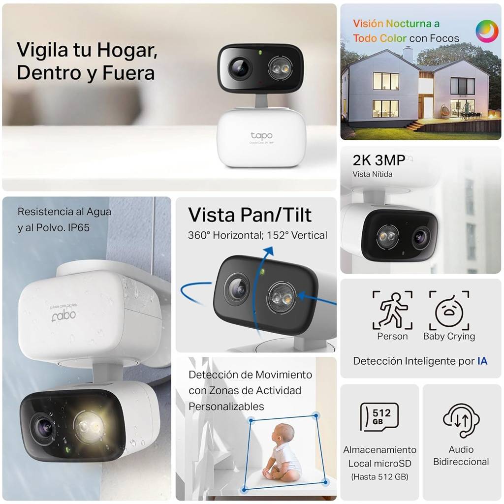 La TP-Link Tapo C216 es una cámara de seguridad Wi-Fi con movimiento Pan/Tilt diseñada para vigilancia tanto en interiores como exteriores. Ofrece resolución 2K 3MP, visión nocturna en color y detección inteligente por IA para identificar personas o sonidos importantes. Gracias a su rotación motorizada y seguimiento automático puede cubrir prácticamente todo el entorno desde una sola cámara. También incorpora audio bidireccional, almacenamiento local mediante microSD y control remoto desde la aplicación Tapo.