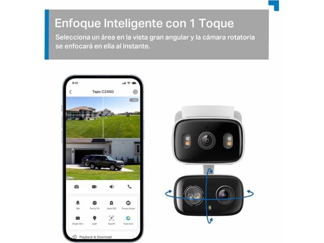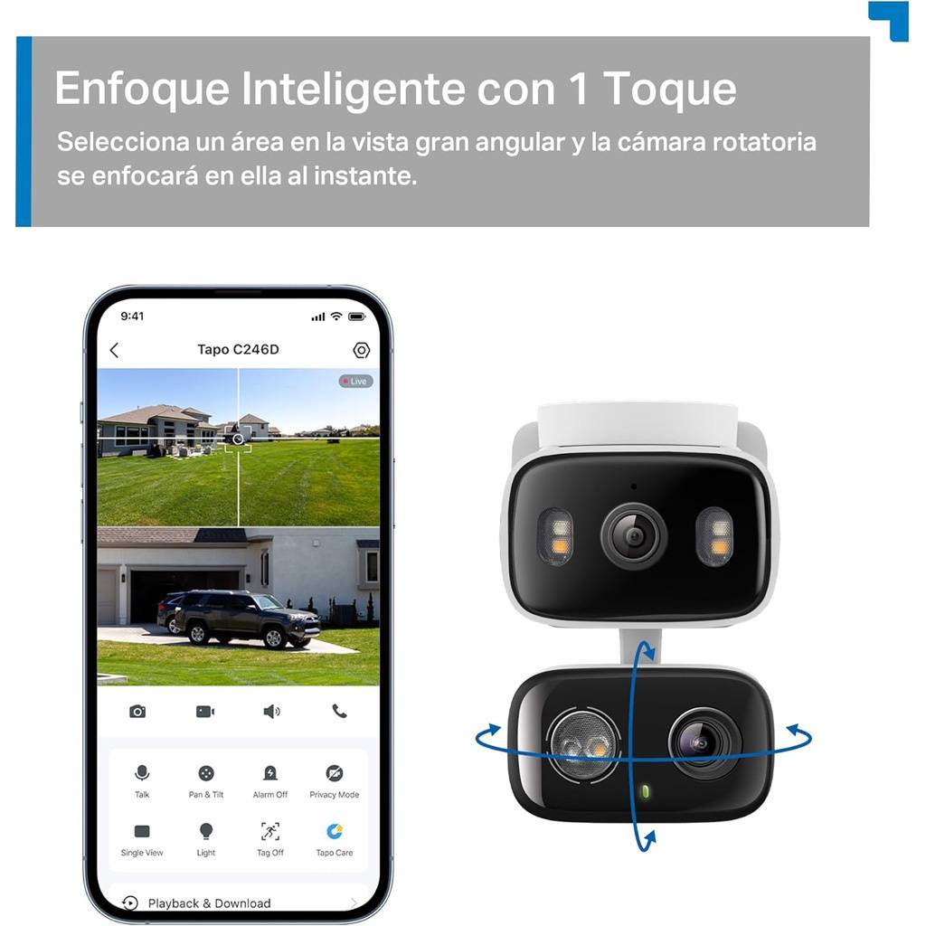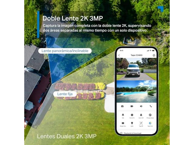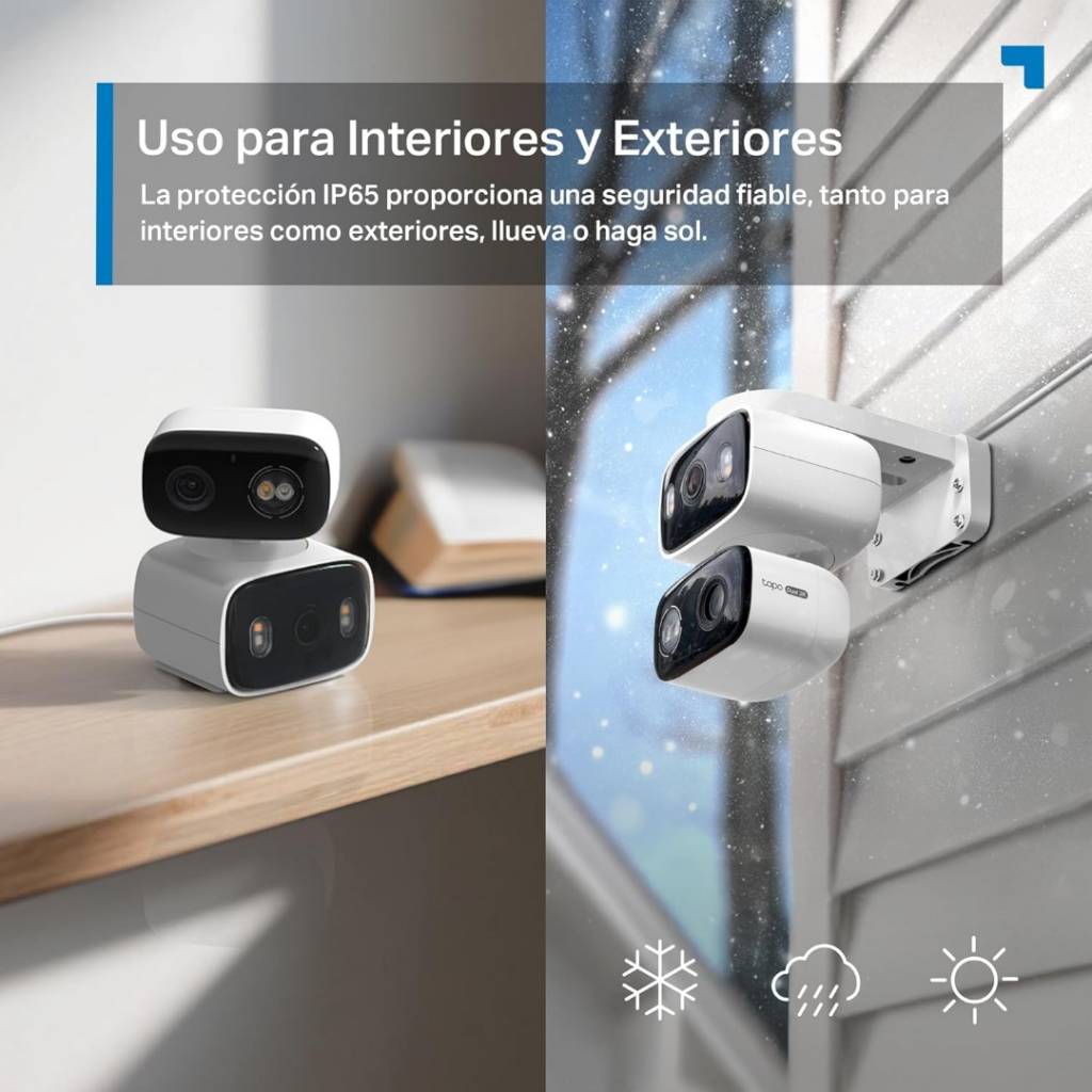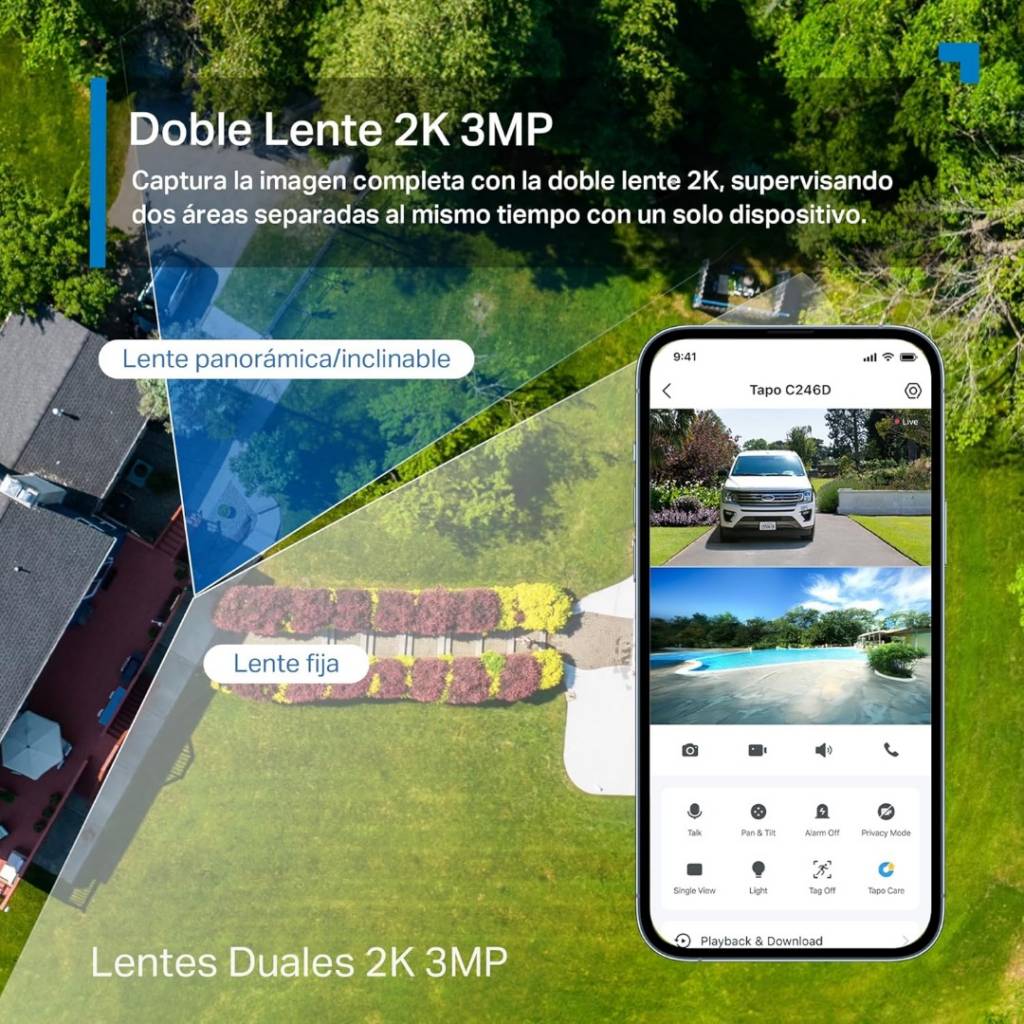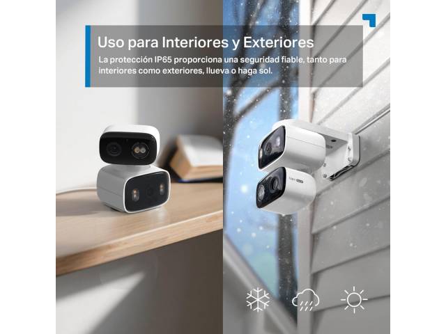 La TP-Link Tapo C246D es una cámara de seguridad Wi-Fi con doble lente y movimiento Pan/Tilt, diseñada para vigilancia interior y exterior. Combina dos cámaras 2K (3MP + 3MP) para cubrir más área al mismo tiempo: una lente gran angular fija y otra motorizada que puede girar y seguir movimiento. Incluye detección inteligente por IA, visión nocturna en color, audio bidireccional y resistencia IP65, lo que la hace ideal para monitorear hogares, oficinas o negocios desde la app Tapo.