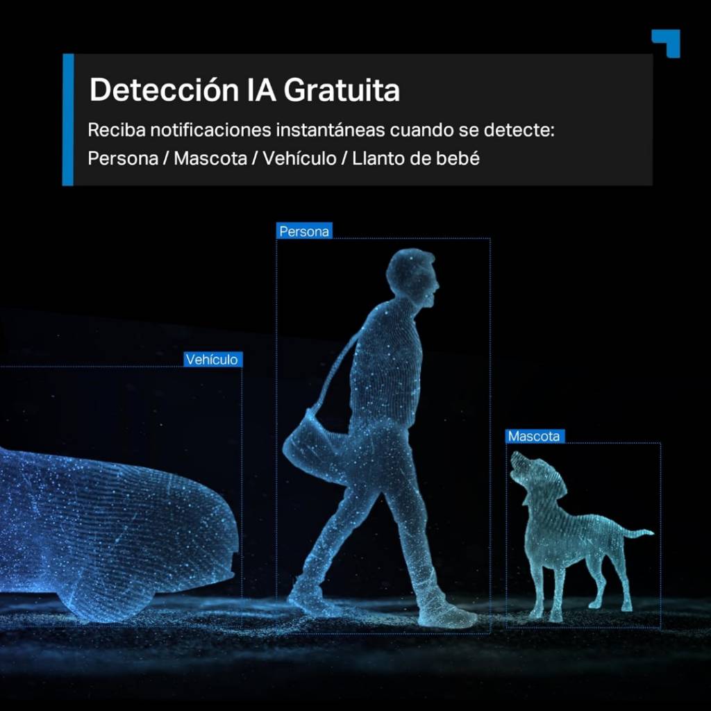 - Detección inteligente por IA: Identifica personas, mascotas y vehículos.