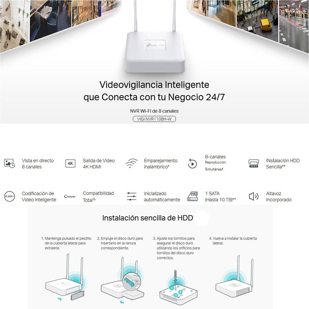 - Visión en directo de 8 canales y salida de vídeo HDMI 4K