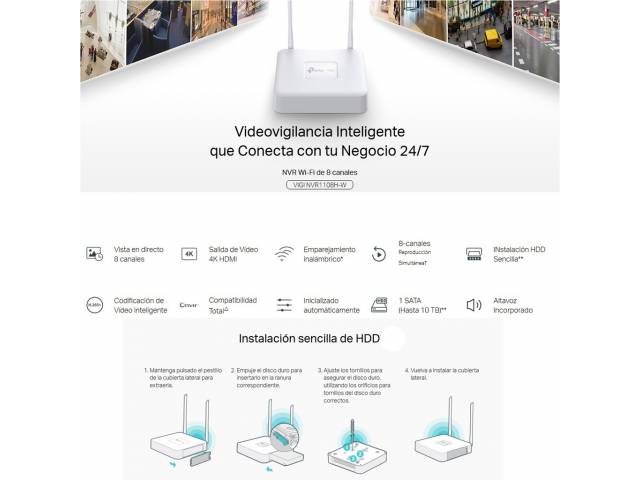 Incluye en caja: NVR, adaptador de corriente, tornillos para HDD, ratón, guía rápida