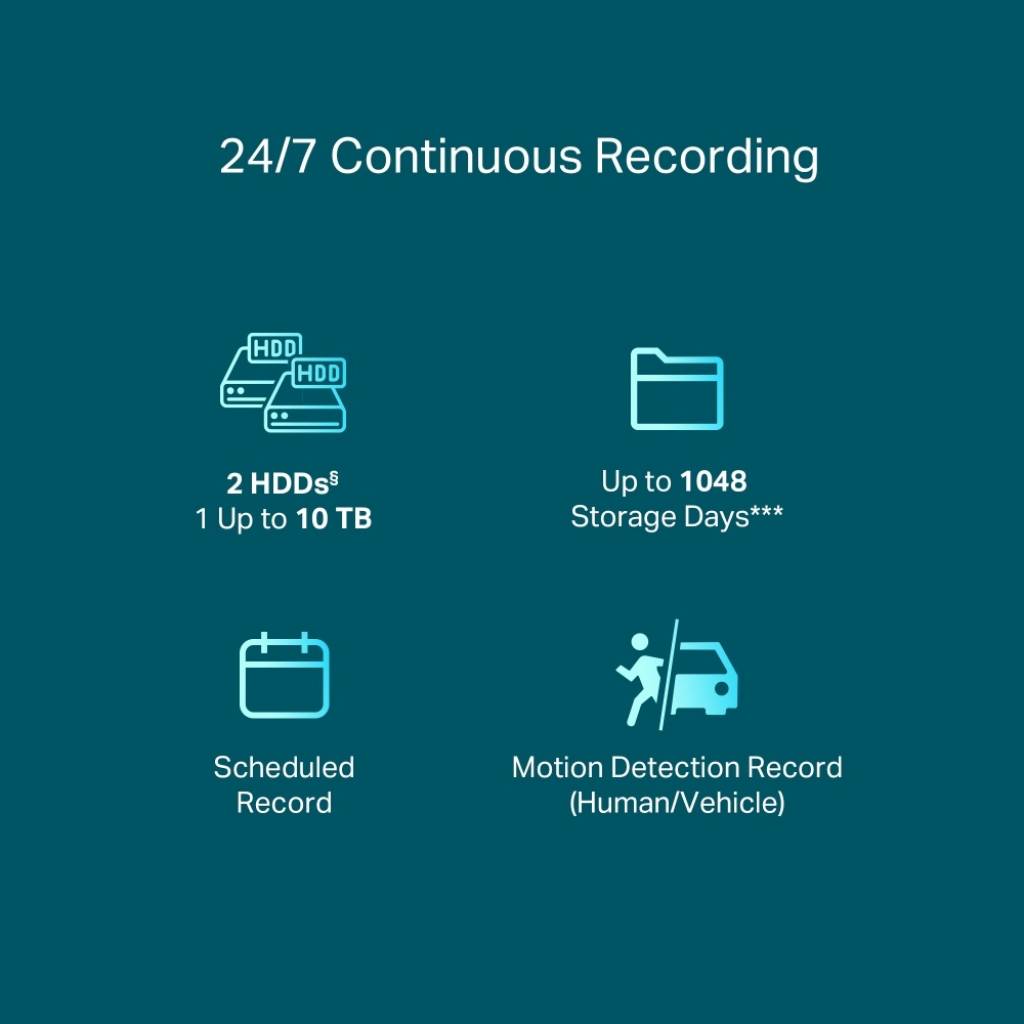 - Grabación continua 24/7. Almacena hasta 20TB de imágenes (1048 días de almacenamiento) de las cámaras conectadas para proteger los datos y poder acceder a ellos de forma rápida y cómoda.