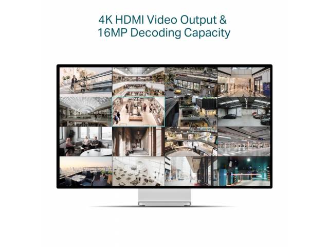 - Salida de vídeo HDMI 4K y descodificación 16MP. Definición de imagen nítida de hasta 8MP, y capacidad de decodificación de 8-ch a 2MP que permite disfrutar de la visualización y reproducción en directo de más canales al mismo tiempo.