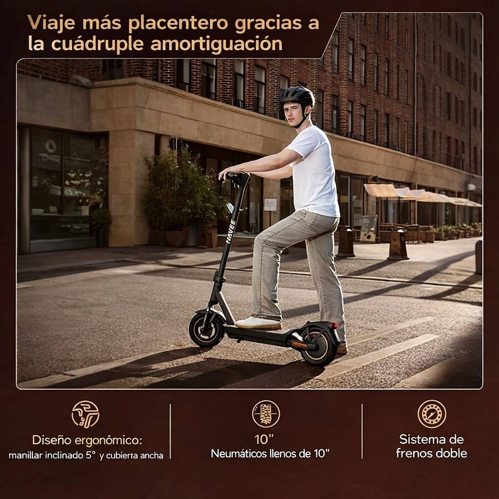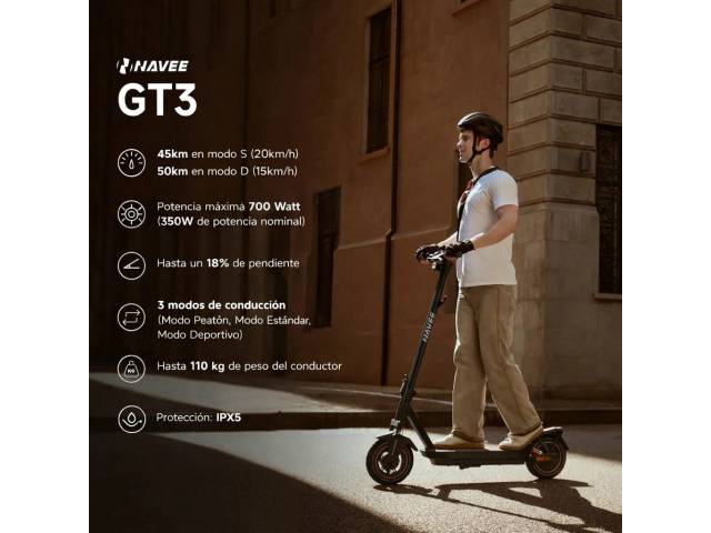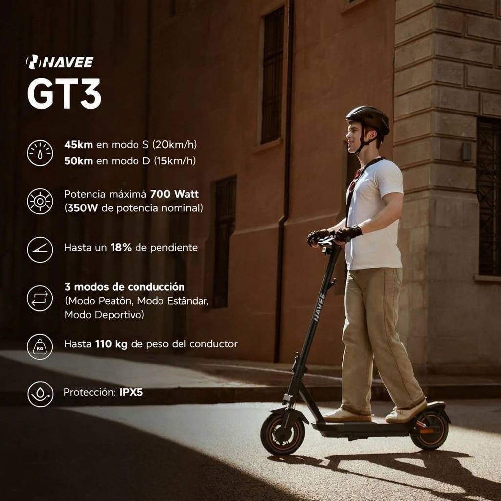 El Navee GT3 es un monopatín eléctrico diseñado para ofrecer un equilibrio ideal entre autonomía, potencia y confort. Con motor de hasta 700W, suspensión doble y neumáticos de 10", brinda una conducción estable y cómoda en ciudad. Su diseño robusto y funciones como desbloqueo por proximidad lo convierten en una excelente opción para uso diario.