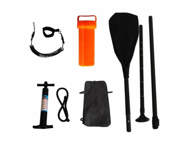 Accesorios: remo ajustable, bomba de inflado, aleta central, correa de seguridad (leash), mochila de transporte y kit de reparación.