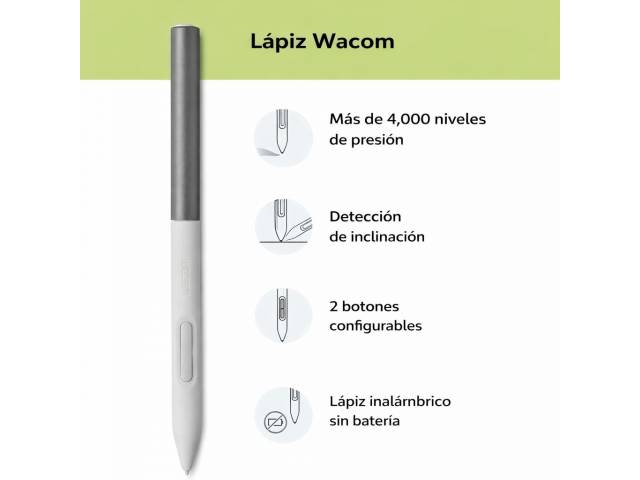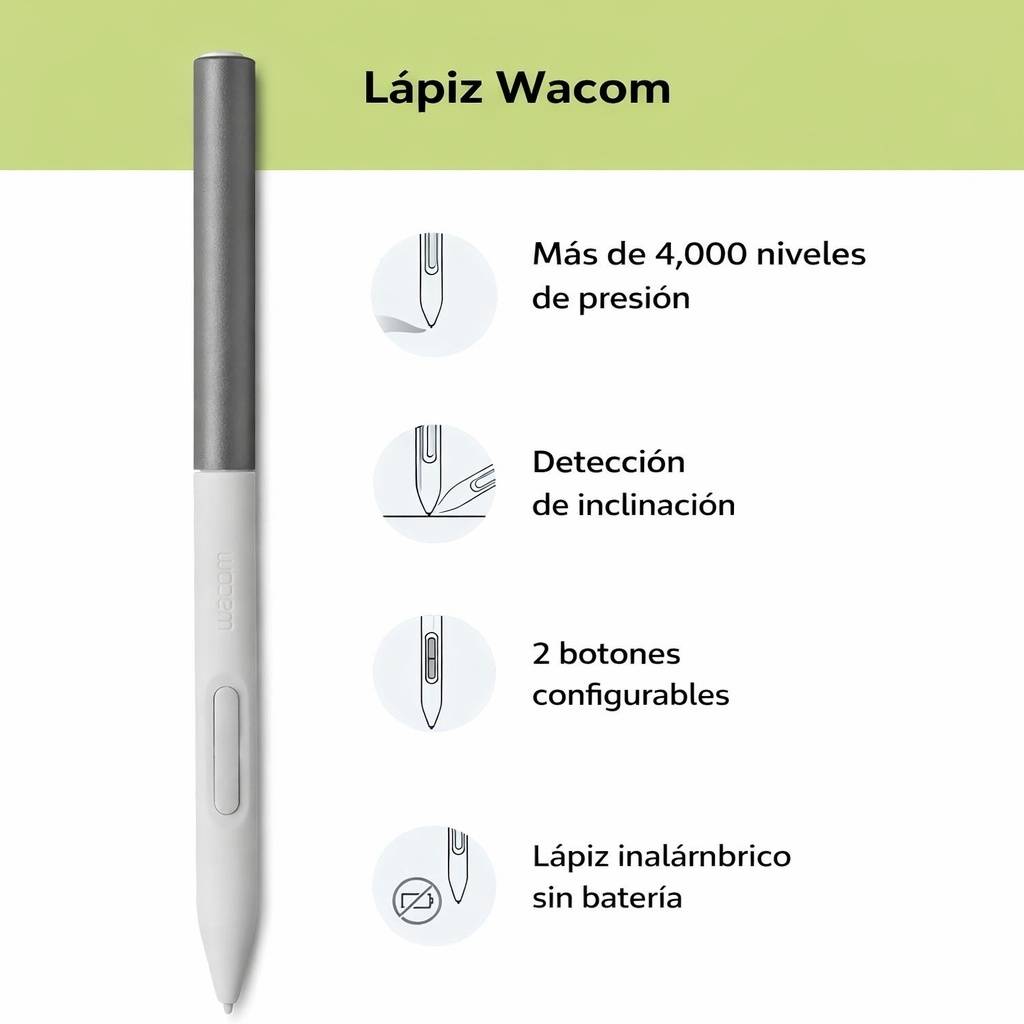 - Lápiz sin batería: Wacom One Pen con 4096 niveles de presión y funcionamiento inalámbrico.